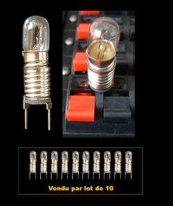 Ampoules (réutilisables) compatibles avec les systèmes délivrant une tension voisine de 70V (MAF50, MAF60SII avec survolteur, MAF100SII, Pyromatic V30...). Se branche directement sur le bornier de sortie de la ligne à tester. Prévu pour un fonctionnement impulsionnel uniquement. Résistance lampe 130 ohms environ.