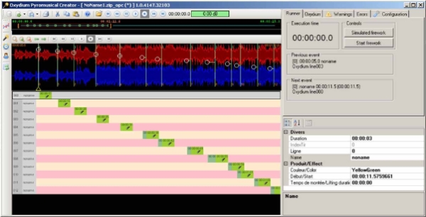 Logiciel accessoire (le logiciel de base pour l'Oxydium étant Oxydium Suite)et gratuit de marquage de fichiers sonores MP3 pour la création de spectacles synchronisés pyro-mélodiques avec la consoleOXYDIUM. Simple d'utilisation : à partir du graphe timeline de votre fichier son généré par le logiciel, vous positionnez les balises correspondant aux voies à mettre à feu (temps minimal entre deux tirs 1/10eme de seconde). Possibilité d'intégrer des retards afin de compenser les temps de montées et d'une base de données de vos produits. Sur le lieu du spectacle, vous connectez votre PC (ou votre contôleur PyroMusical) à l'OXYDIUM à l'aide du cordon USB, et à partir du logiciel OXYDIUM PYROMUSICAL CREATOR, simultanément à la musique, les voies seront automatiquement mises à feu. Pour ordinateur PC sous windows.