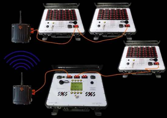 5/ Configuration avec deux satellites pilotés par radio HF et six satellites pilotés par fil : L'Oxydium envoie ses ordres à deux satellites par liaison radio indépendantes et six autres par fil.